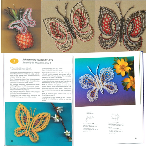 Alle Klöppelbriefe und farbige Abbildungen der fertigen Schmetterlinge sind enthalten, sowie wo nötig, auch Detail- bzw. Arbeitszeichnungen.