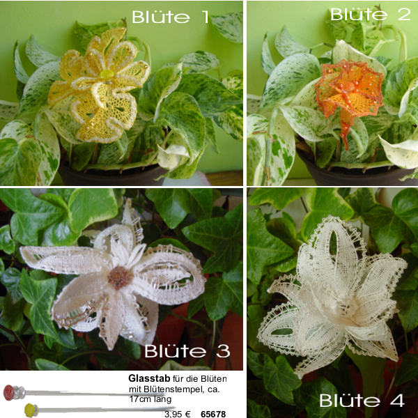 Sie erhalten ein Umschlagblatt DIN A3 mit farbigen Abbildungen der fertigen Blüten und bebilderten Montageanleitung. Auf drei Blatt DIN A4 sind Klöppelbriefe für 4 verschiedene Blüten. Die Klöppelbriefe sind ohne Anleitung und ohne eingezeichnete Nadelpunkte. Es sind nur einige kurze Hinweise vorhanden.