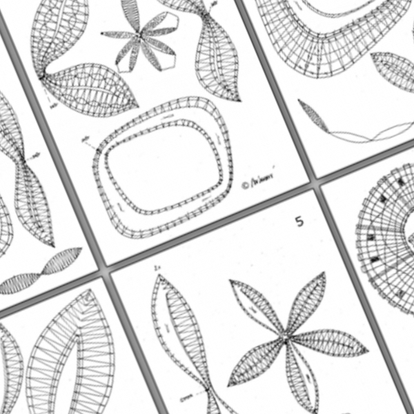 Das Motiv-Set beteht aus einem Deckblatt mit farbigen Abbildungen der Spitzen plus 6 Blätter DIN A4 mit insgesamt 6 Motiven. Die Nadelpunkte sind nicht angegeben, aber die Klöppeltechnik.