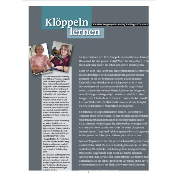 Lehr- und Lernbuch in die Grundlagen des Spitzenklöppelns, geeignet für Flachkissen und Klöppelrolle.