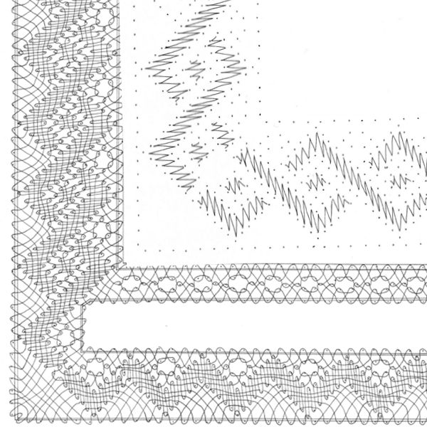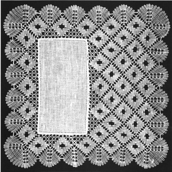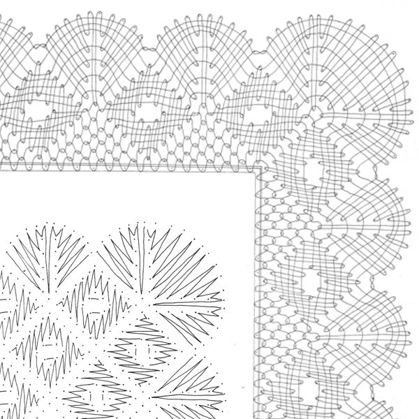 Klöppelbriefe mit Nadelpunkten und technische Zeichnung ins SW.