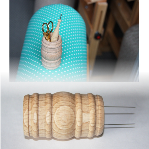 Durchmesser ca. 5cm (innen 3,2cm), Höhe ca. 8cm, mit 2 Nadeln zum Aufstecken auf Ihr Klöppelkissen.
